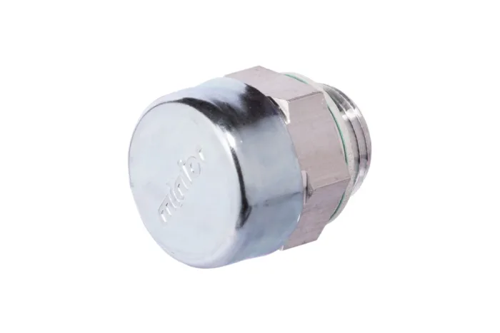 Air vent plug with a check valve and O-ring mounted at the top of the tank. Opens during pressure increase in the tank (oil turbulence). Prevents contamination from entering the system during hydraulic oil suction. Check valve opening pressure: 0.15 ÷ 0.3 bar. Material: aluminum (body), steel (cover), guarnital (fiber washer). Operating temperature: from -20°C to +100°C.