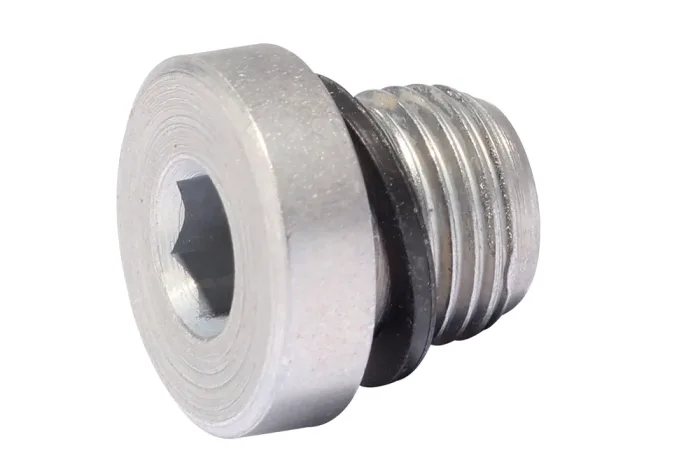 DIN 2353 plug, type VSTI-BE for hex key: external BSP thread (sealing DIN 3852 type E – elastomer gasket with a rectangular cross-section). Surface coated with zinc-nickel with a layer thickness of 6-10 µm, which is characterized by very high corrosion resistance (up to 720 hours without corrosion in a salt spray chamber). Material: carbon steel, zinc-nickel.
