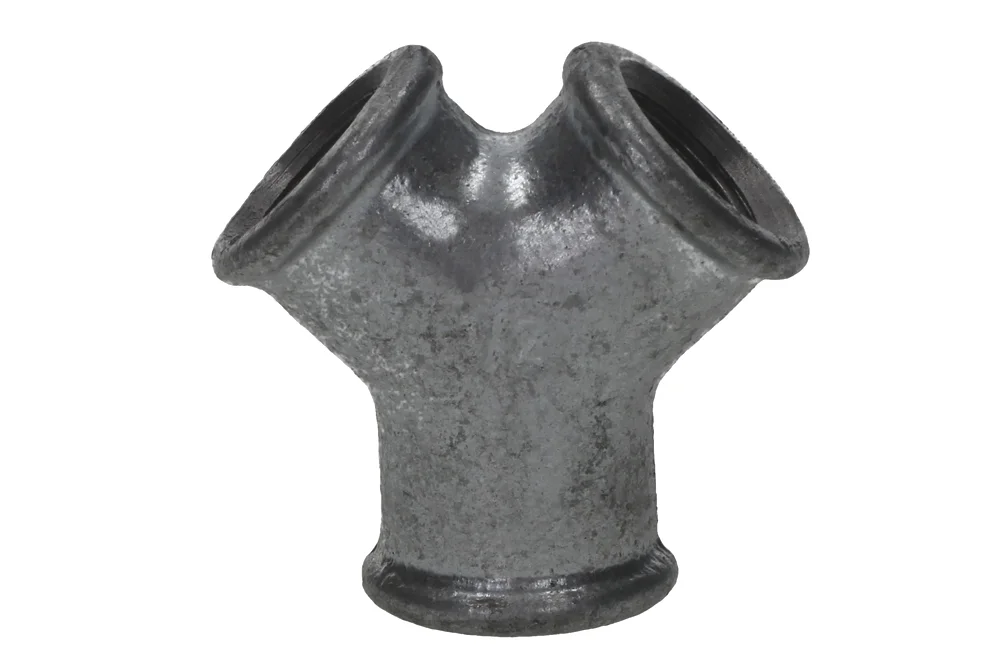 Y-branch with internal BSP thread for use in piping connections of industrial installations. Material: ductile iron. Operating temperature: up to +300°C. Working pressure: 25 bar (up to +120°C), 20 bar (up to +300°C).